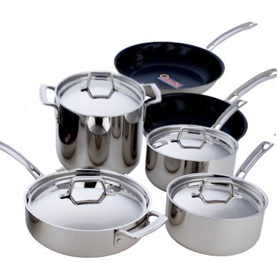 Set includes: 8 inch Non-stick fry pan, 10 inch Non-stick fry pan, 2 Quart Sauce pan with Lid, 3 Quart Sauce pan with Lid, 3 Quart Saute pan with Lid and 8 Quart Stock pot with Lid.