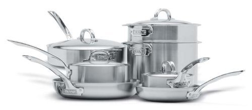 Viking VSC1012 11 Piece Stainless Steel Cookware Set OverviewsViking professional cookware products are manufactured with exclusive multi-ply construction. Multi-Ply construction is a specially designed combination of stainless steel and aluminum alloys for lifetime performance, durability with easy cleanup, quick and even heat distribution. The Multi-Ply material used in Viking cookware is the most advanced formulation of stainless steel and aluminum alloys in the world today. This exclusive combination of layers conducts heat more evenly and quickly to give you better results. Known for its exceptional appliances, its professional cookware products are manufactured in Belgium yet designed in the U.S., so you get the best of both worlds. If you're choosy about how your cookware not only looks but also performs, Viking is the ultimate choice. Like the professional appliances that preceded this distinguished cookware line, the quality is the outstanding feature. Each piece features an exclusive 7-ply construction of 18/10 stainless steel and aluminum alloys paired with ergonomic handles that have stay cool vents for comfort while cooking. You may use Viking cookware on any heating surface, including halogen, induction and ceramic, plus gas and electric.18/10 Stainless interior and exterior, 7 ply construction with 5 ply on the stock pots, aluminum core for even heat distribution, used on any cooking surface, ergonomically designed, cast s/s, and stay cool handles. This set includes: 1.5-qt. Covered Sauce Pan, 3-qt. Covered Sauce Pan, 3-qt. Covered Sauté' Pan, 8-Inch Fry Pan, 11-Inch Fry Pan, 8-qt. Covered Stock Pot, and 9.5-Inch Pasta Insert.